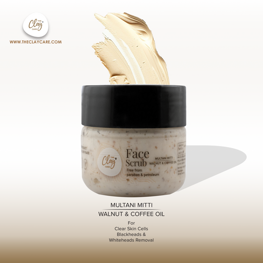 Clay Care Multani Mitti Face Scrub - Fuller Earth Walnut coffee oil Blackheads Whiteheads dead skin removal face scrub for glowing skin acne prone oily skin women men boy girl detan tan removal exfoliating dirt pimple mark pigmentation remover - 10 g